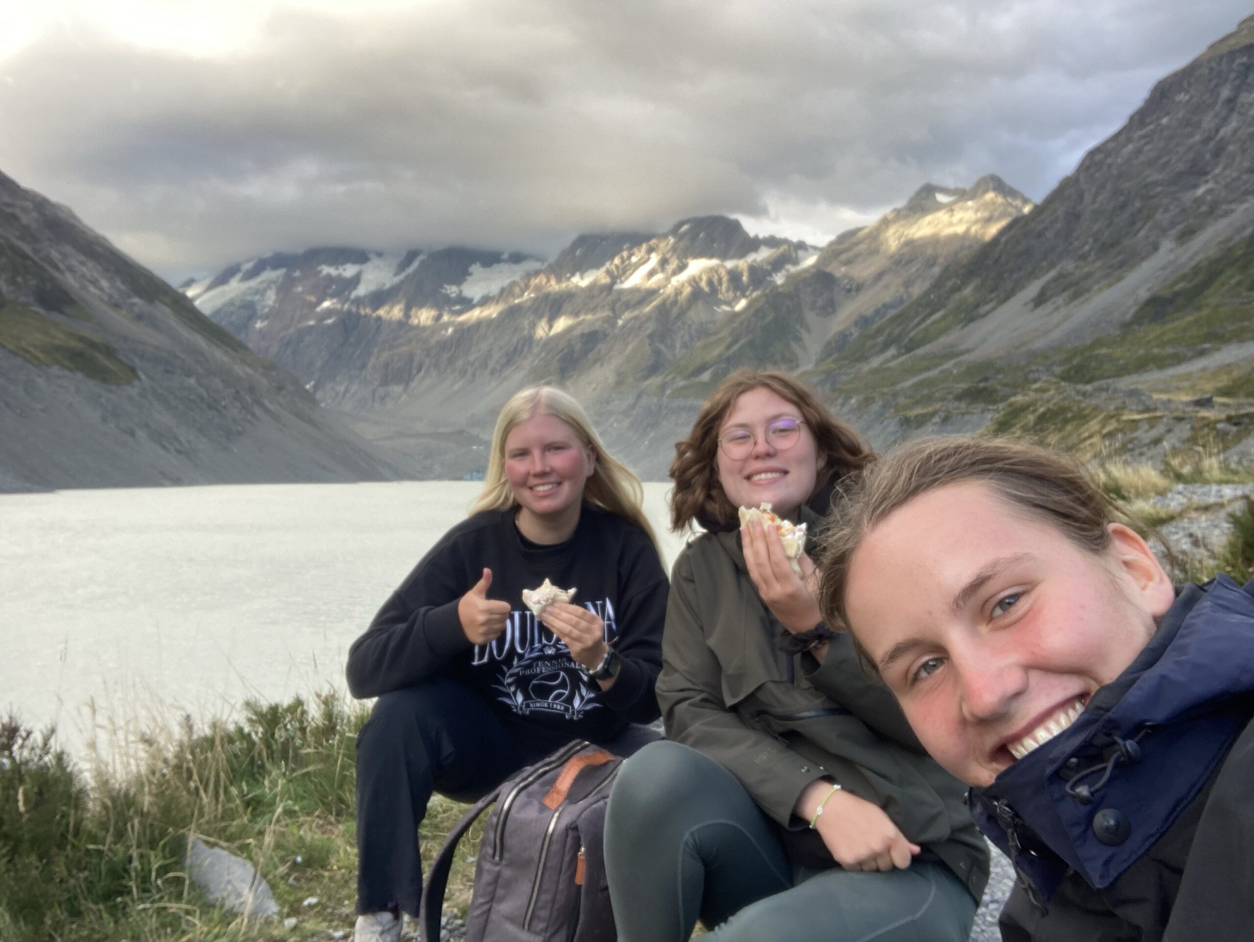 Um bei Sonnenuntergang noch den Hooker Valley Track zu machen, haben wir uns gegen 17 Uhr doch nochmal aufgerafft und sind in den Mount Cook Nationalpark gefahren. Der Track war eher ein kleiner Spaziergang, hatte aber ein paar spannende Hängebrücken drin. Weil es jedoch recht bewölkt war, hatten wir weder Glück mit dem Sonnenuntergang, noch konnten wir Mount Cook wirklich sehen. Und ja, wir hatten sehr viel Spaß beim Fotos machen. Man beachte auch unsere schnellen Brillen mit der starken Kombi der Socken über der Hose.