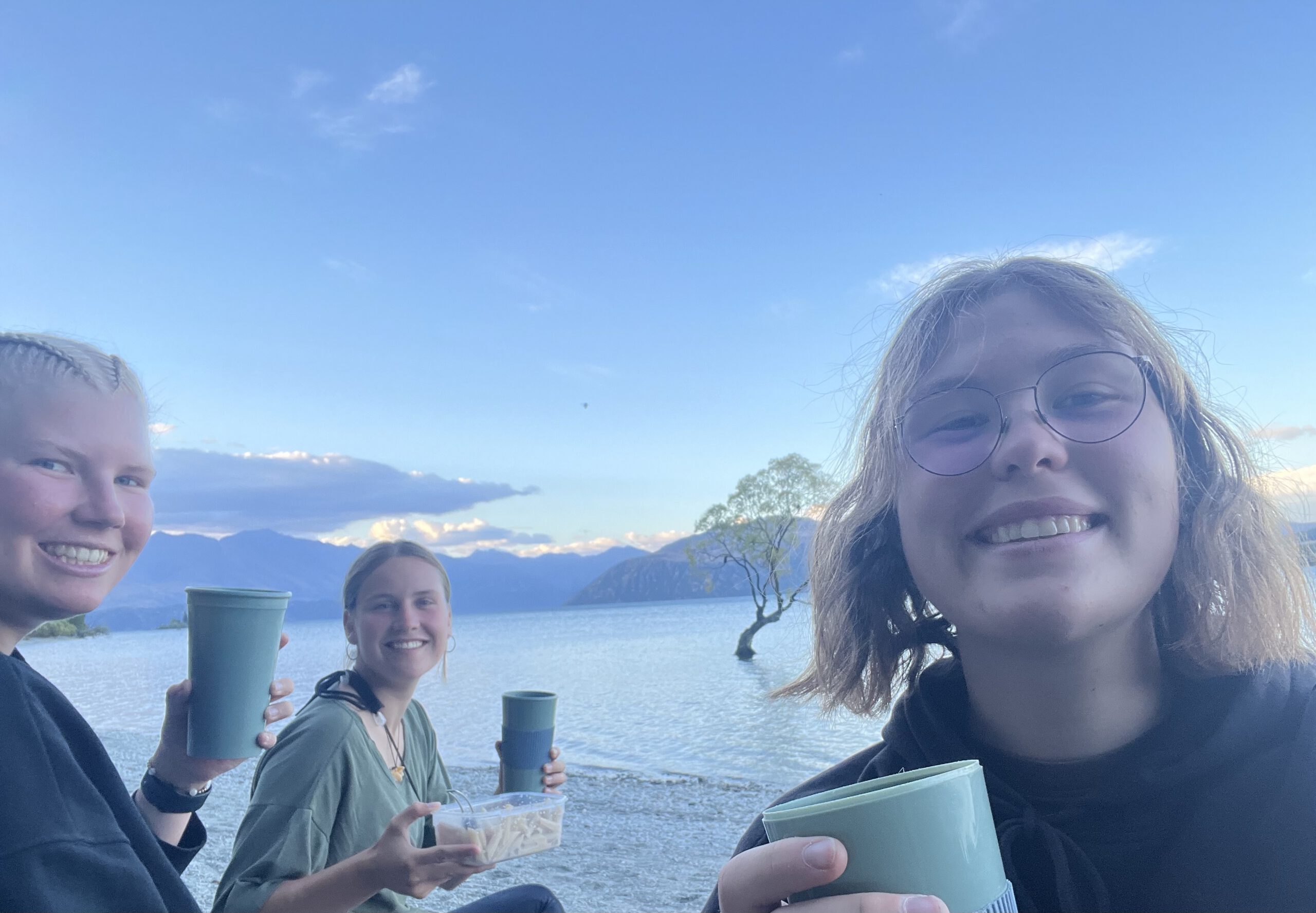 Dort angekommen mussten wir noch schnell einkaufen und dann hieß es auch schon schnell kochen, da wir uns vorgenommen hatten, am Wanaka-Tree (das ist der wohl meist fotografierteste Baum in Neuseeland, welcher Touristen, eben auch uns, aus aller Welt anzieht, nur weil er einsam in einem See steht.), während des Sonnenuntergangs Abend zu essen. Und weil zu so einem speziellen Anlass natürlich auch der Wein und das gute Essen nicht fehlen darf, haben wir uns mal wieder die Nudeln mit Pilzsoße gemacht und dazu den zweiten Wein von Ben, diesmal einen Rosé, getrunken. Es war zwar etwas komisch und unangenehm, von unserem Campingplatz bis zu dem Baum, mit einem Topf voll Nudeln herum zu laufen aber so hatten immerhin die anderen Menschen etwas zu lachen.