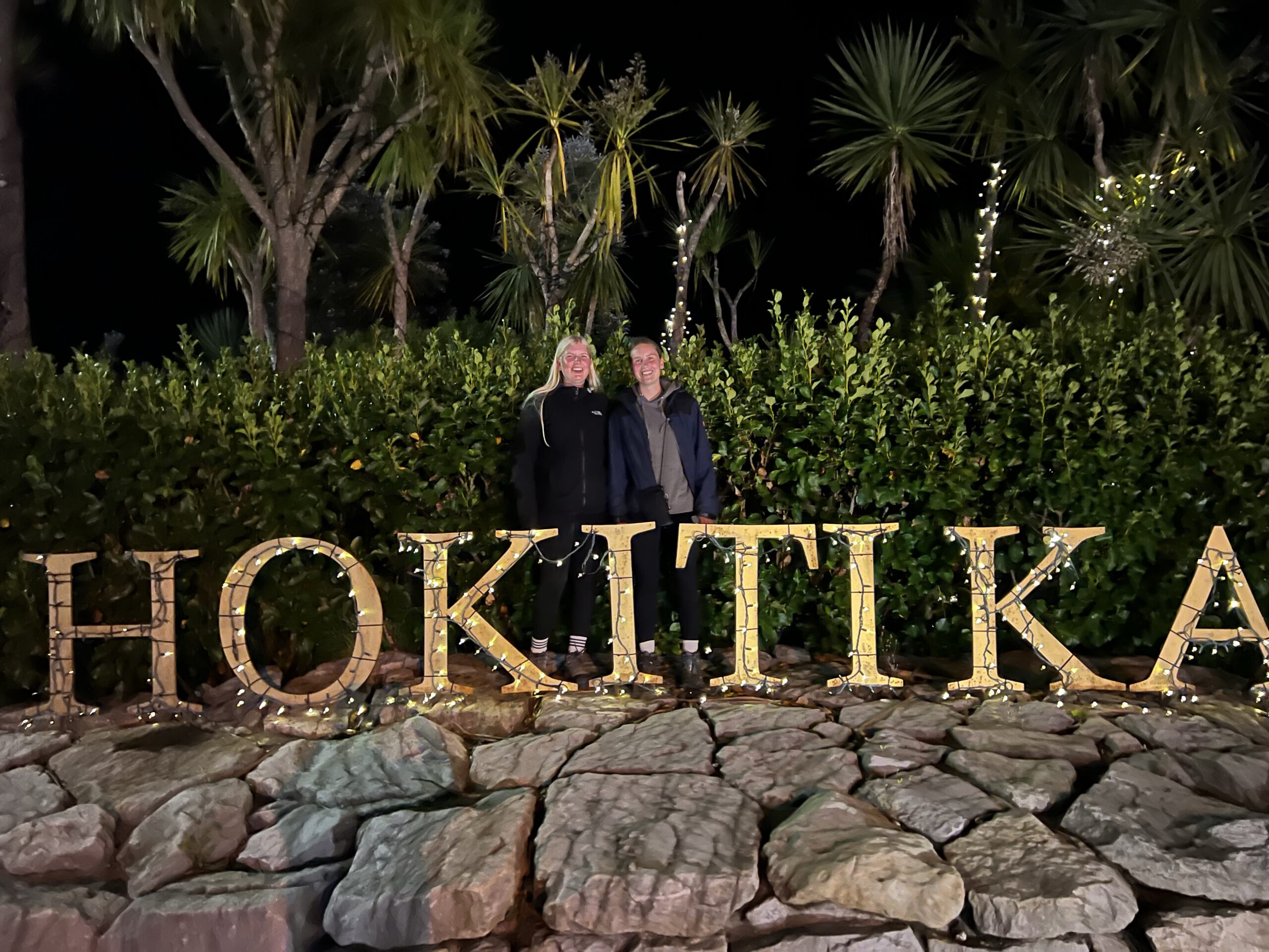 Auf dem Rückweg ist Kevin noch beim „Hokitika“ Schriftzug der Stadt angehalten und wir sollten uns dahinter stellen, damit er ein Foto macht. Etwas unangenehm aber das Bild hat sich als ganz schön herausgestellt.